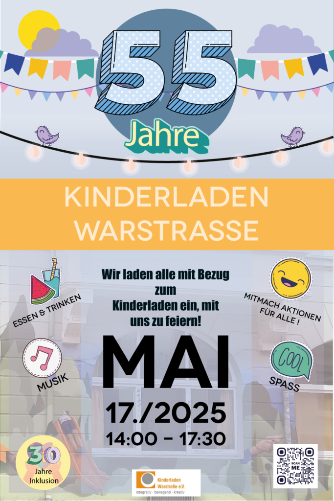 Der Kinderladen Warstraße feiert am Samstag, den 17. Mai 2025 sein 55. Jubiläum und lädt alle (ehemaligen) Familien, Mitarbeitenden sowie die Nachbarschaft und alle weiteren Menschen mit Bezug zum Kinderladen ein, mit uns zu feiern.